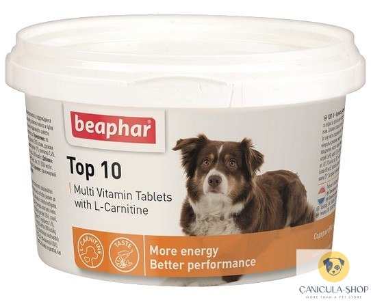 Beaphar TOP 10 Dog preparat witaminowy z L-karnityną dla psa to preparat witaminowo-mineralny dla psów. Zawiera witaminy, minerały i elementy śladowe, wpływające na poprawę witalności wytrzymałości oraz na wzmocnienie kondycji fizycznej psa. Top 10 stymuluje naturalny rozwój kości i zębów u młodych psów. Wynikiem stosowania tego preparatu jest zdrowa sierść i błyszczące oczy oraz zwiększona witalność u psów starszych. Dodatek L-karnityny gwarantuje silne mięśnie.