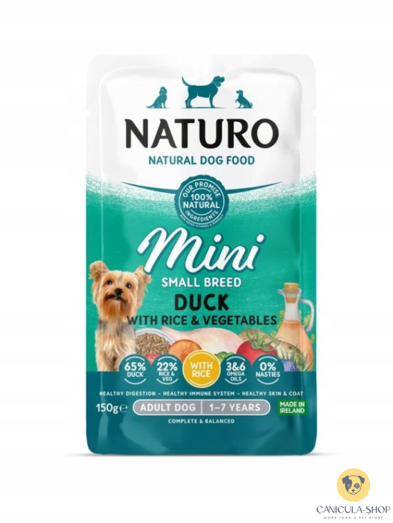 NATURO MINI - kaczka z ryżem i warzywami 150g to mokra karma dla dorosłych psów małych ras zawierająca 60% kaczki, najwyższej jakości białko oraz doskonałe źródło witamin i minerałów.