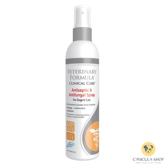VFCC - Spray antyseptyczny i przeciwgrzybiczy dla psów i kotów - Niweluje nieprzyjemne zapachy, może łagodzić dolegliwości przy infekcjach grzybiczych i bakteryjnych, takich jak zapalenie skóry, piodermia. Aloes wpływa kojąco i łagodzi wrażliwą skórę. Skutecznie niweluje nieprzyjemne zapachy, może wykazywać działanie łagodzące dolegliwości przy infekcjach grzybiczych i bakteryjnych skóry takie jak zapalenie, piodermia, mające podłoże alergiczne, zaburzenia hormonalne, niedoczynność tarczycy, osłabiony układ odpornościowy, zwierzęta z krótkim płaszczem lub fałdami skóry, urazy podczas pielęgnacji, zakażenia grzybicze.